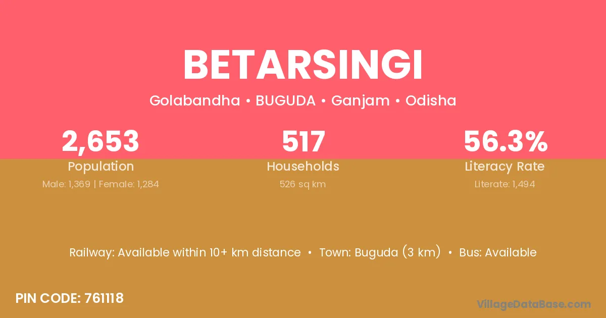 Buguda (3 km) is the nearest town to Betarsingi village for major economic activities and is located approximately 3 km away.