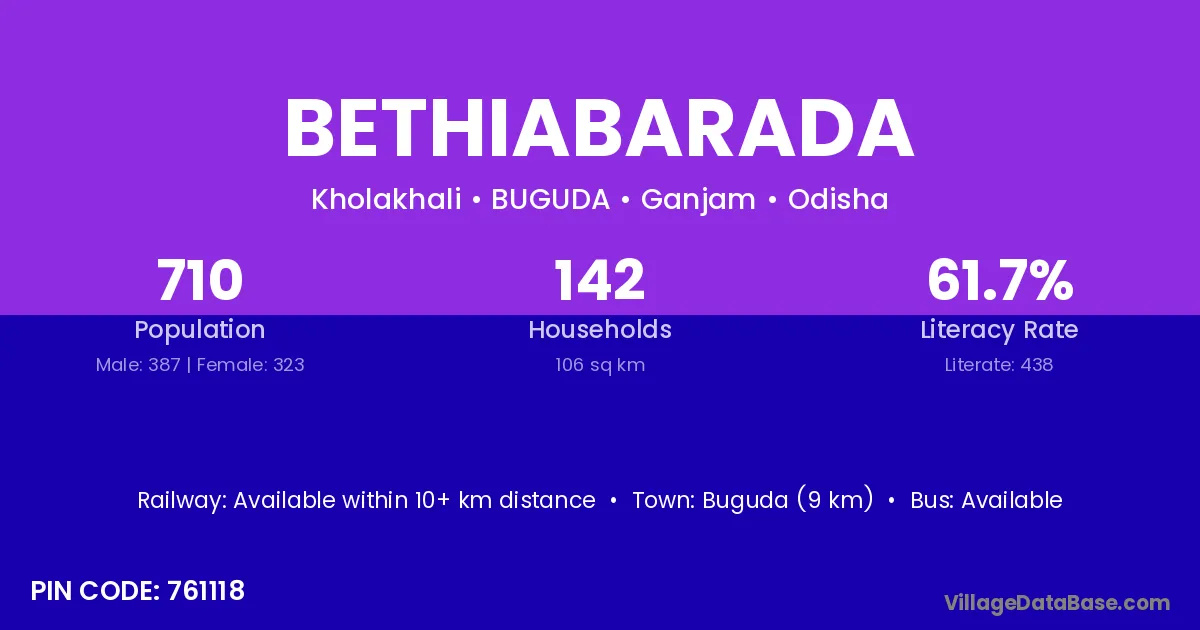 Buguda (9 km) is the nearest town to Bethiabarada village for major economic activities and is located approximately 9 km away.