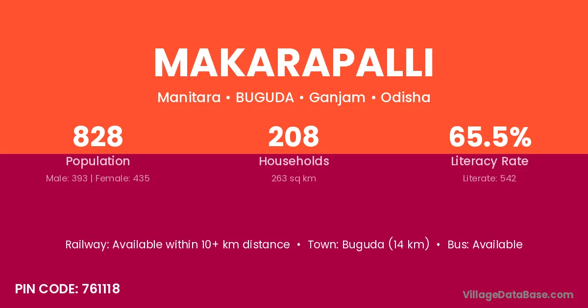 Buguda (14 km) is the nearest town to Makarapalli village for major economic activities and is located approximately 14 km away.
