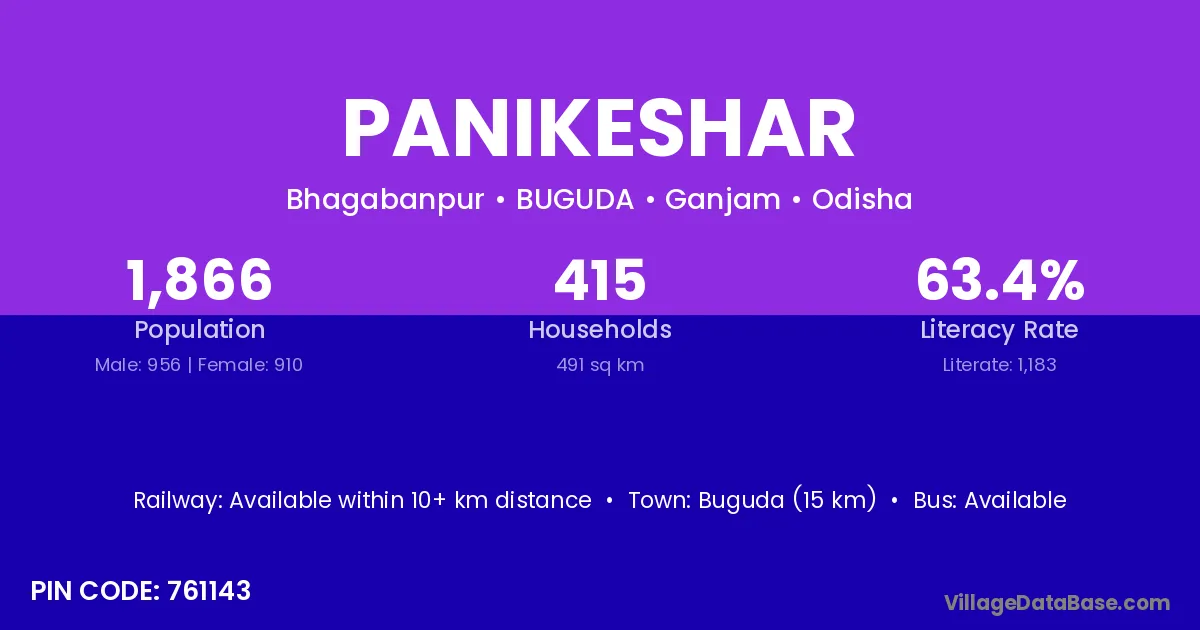 Buguda (15 km) is the nearest town to Panikeshar village for major economic activities and is located approximately 15 km away.