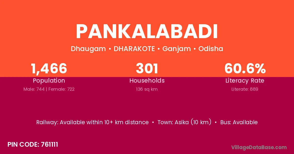 Buguda (8 km) is the nearest town to Pankalabadi village for major economic activities and is located approximately 8 km away.