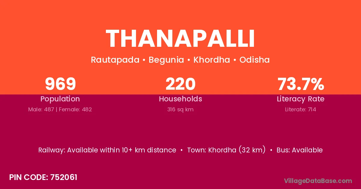 Buguda (7 km) is the nearest town to Thanapalli village for major economic activities and is located approximately 7 km away.