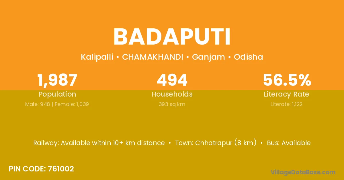 Chhatrapur (8 km) is the nearest town to Badaputi village for major economic activities and is located approximately 8 km away.