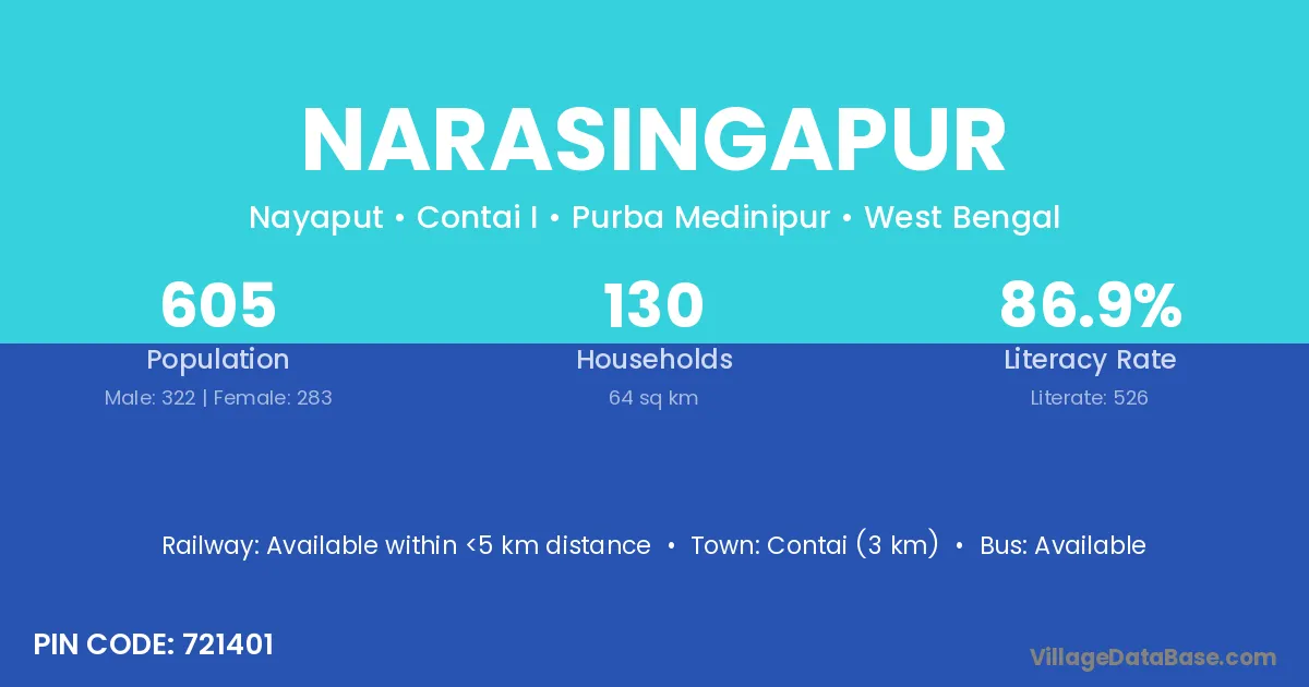Chhatrapur (12 km) is the nearest town to Narasingapur village for major economic activities and is located approximately 12 km away.