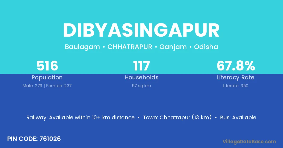 Dibyasingapur village has a total population of 516 people, of which 279 are males and 237 are females.