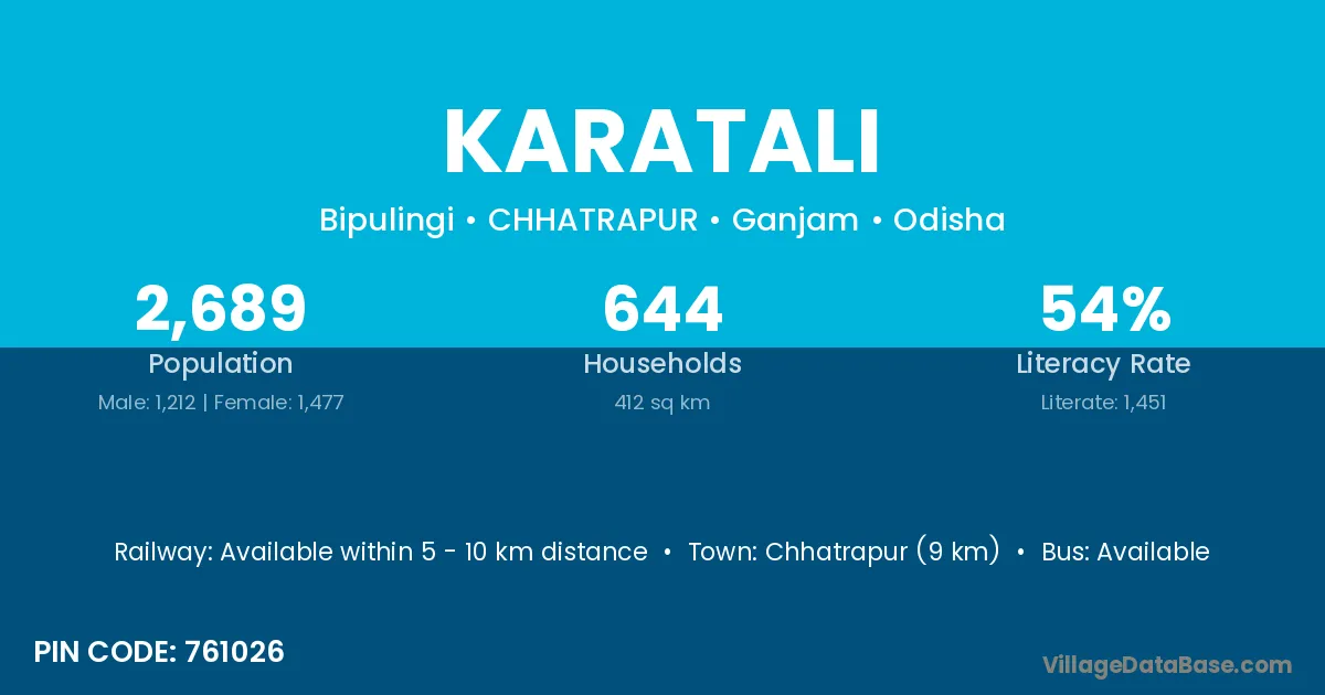 Chhatrapur (9 km) is the nearest town to Karatali village for major economic activities and is located approximately 9 km away.