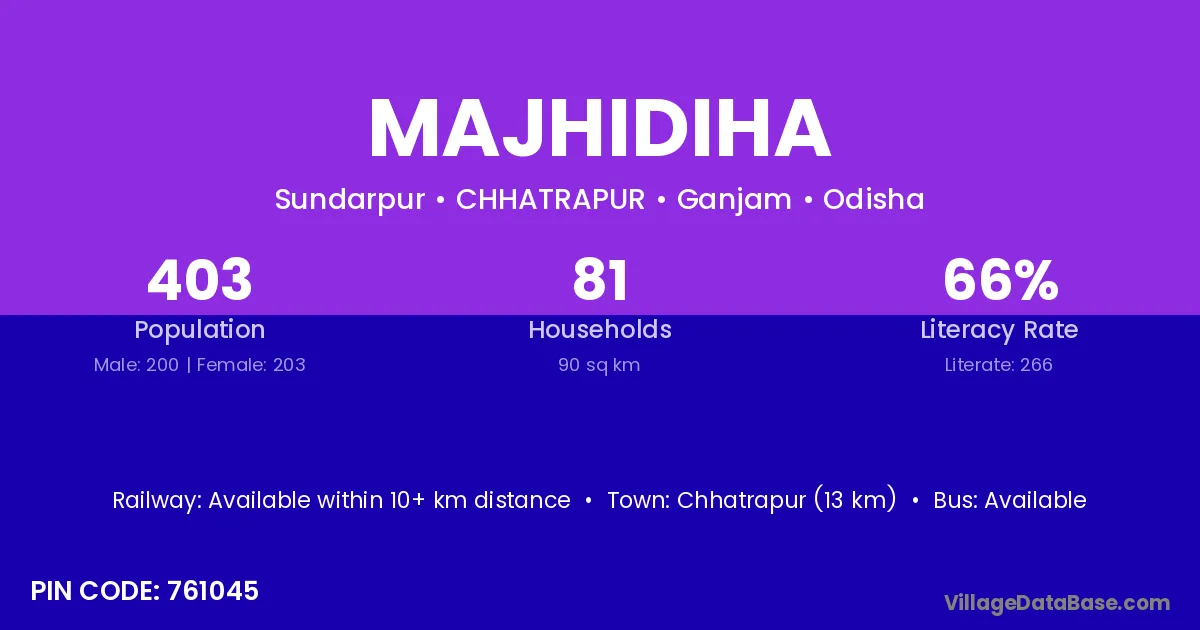 Chhatrapur (13 km) is the nearest town to Majhidiha village for major economic activities and is located approximately 13 km away.
