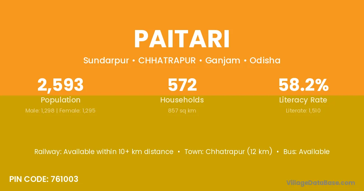 Chhatrapur (12 km) is the nearest town to Paitari village for major economic activities and is located approximately 12 km away.