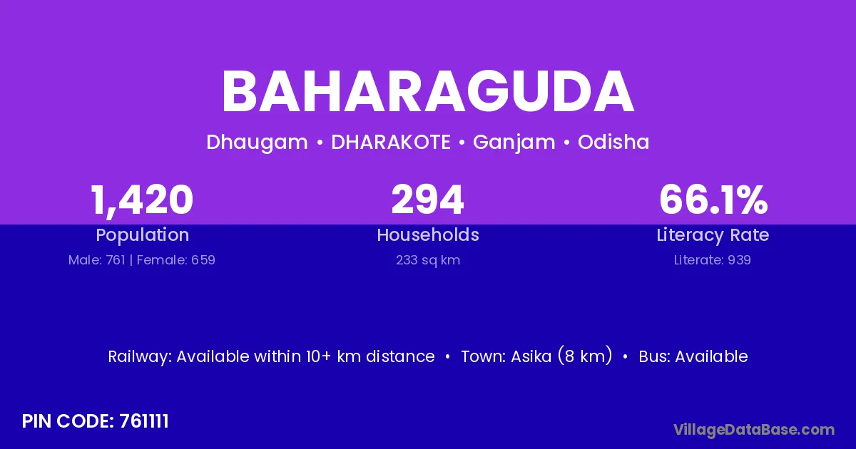 Asika (8 km) is the nearest town to Baharaguda village for major economic activities and is located approximately 8 km away.