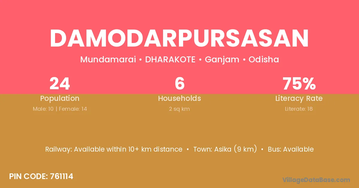 Asika (9 km) is the nearest town to Damodarpursasan village for major economic activities and is located approximately 9 km away.