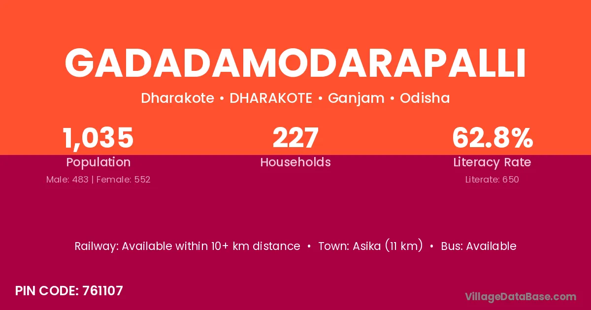 Asika (11 km) is the nearest town to Gadadamodarapalli village for major economic activities and is located approximately 11 km away.