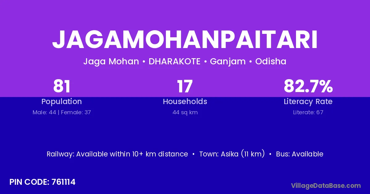 Asika (11 km) is the nearest town to Jagamohanpaitari village for major economic activities and is located approximately 11 km away.