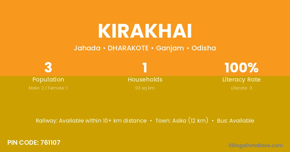 Asika (12 km) is the nearest town to Kirakhai village for major economic activities and is located approximately 12 km away.