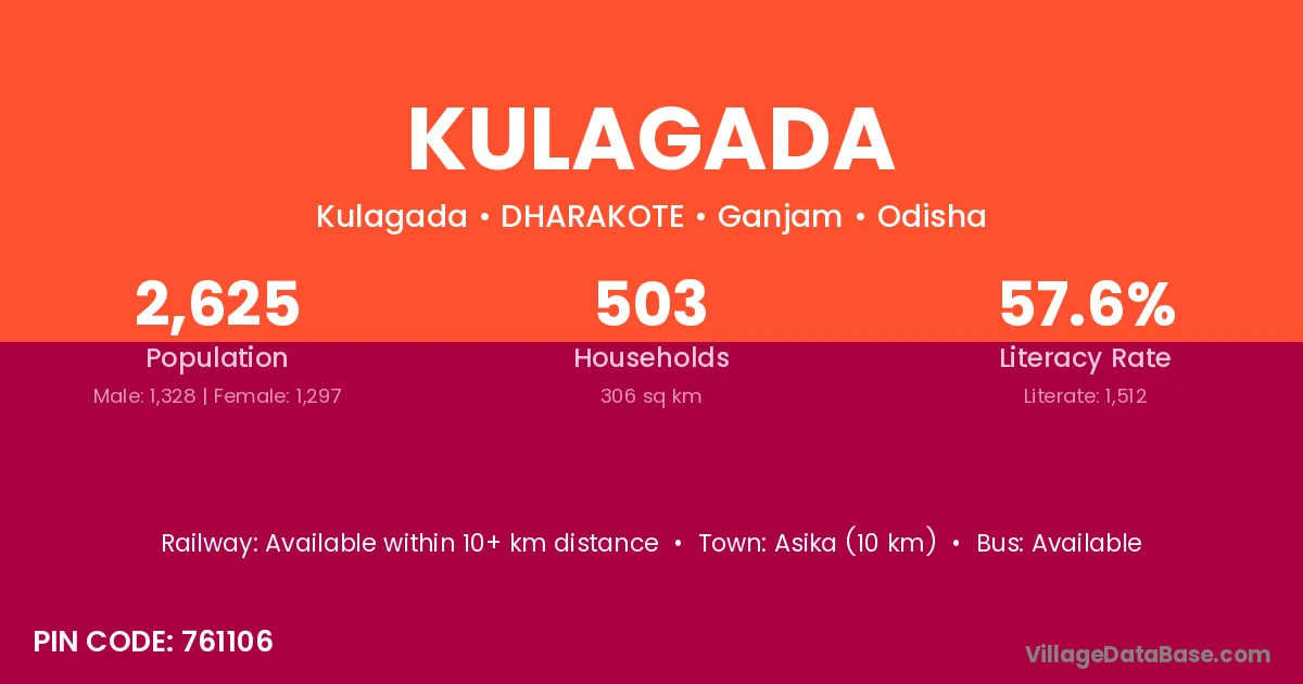 Asika (10 km) is the nearest town to Kulagada village for major economic activities and is located approximately 10 km away.