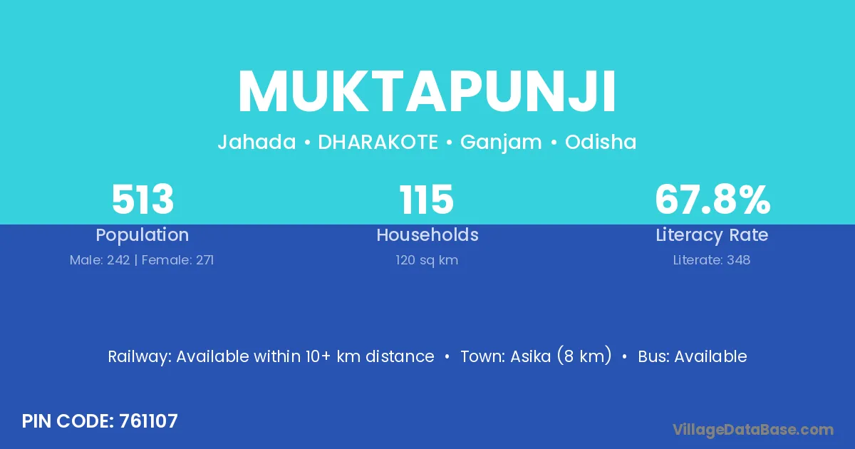 Asika (8 km) is the nearest town to Muktapunji village for major economic activities and is located approximately 8 km away.