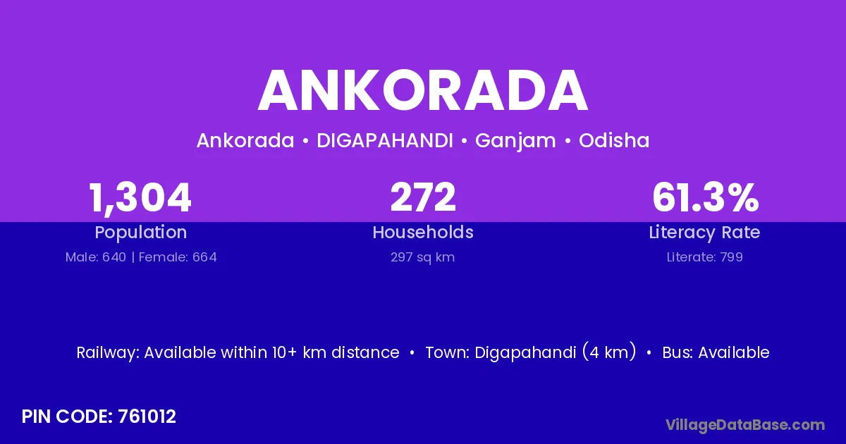 Digapahandi (4 km) is the nearest town to Ankorada village for major economic activities and is located approximately 4 km away.