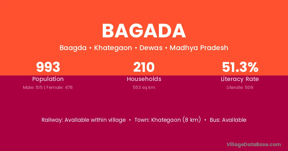 The literacy rate of Bagada village is 66.04%. Male literacy stands at 76.78% and female literacy at 55.59%.