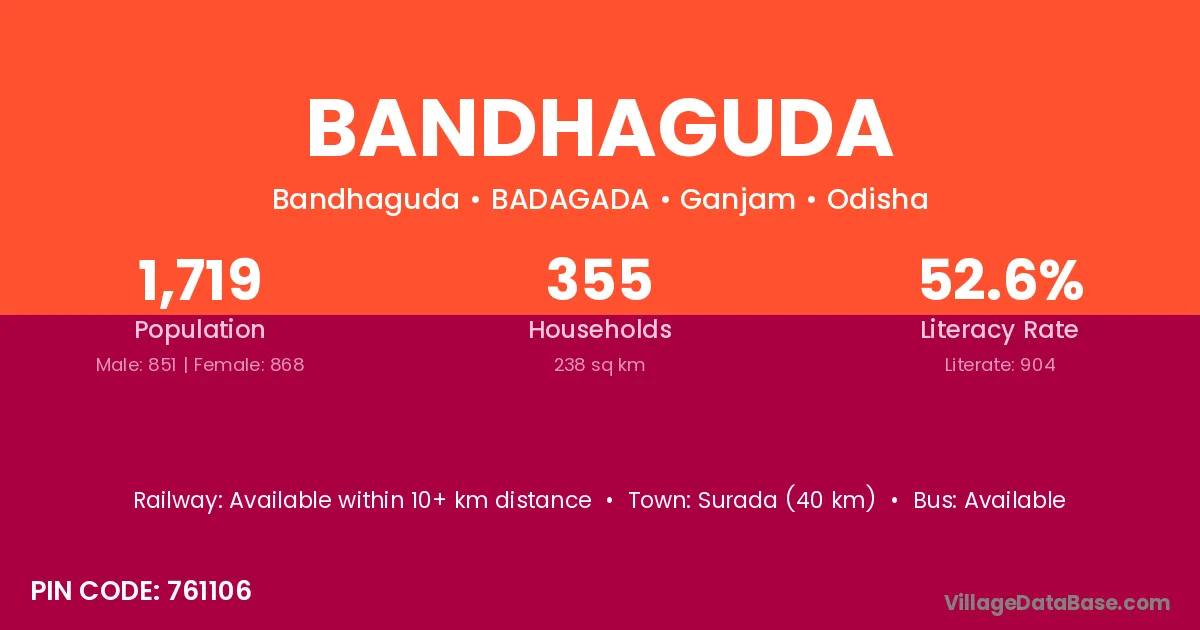 Brahmapur (12 km) is the nearest town to Bandhaguda village for major economic activities and is located approximately 12 km away.