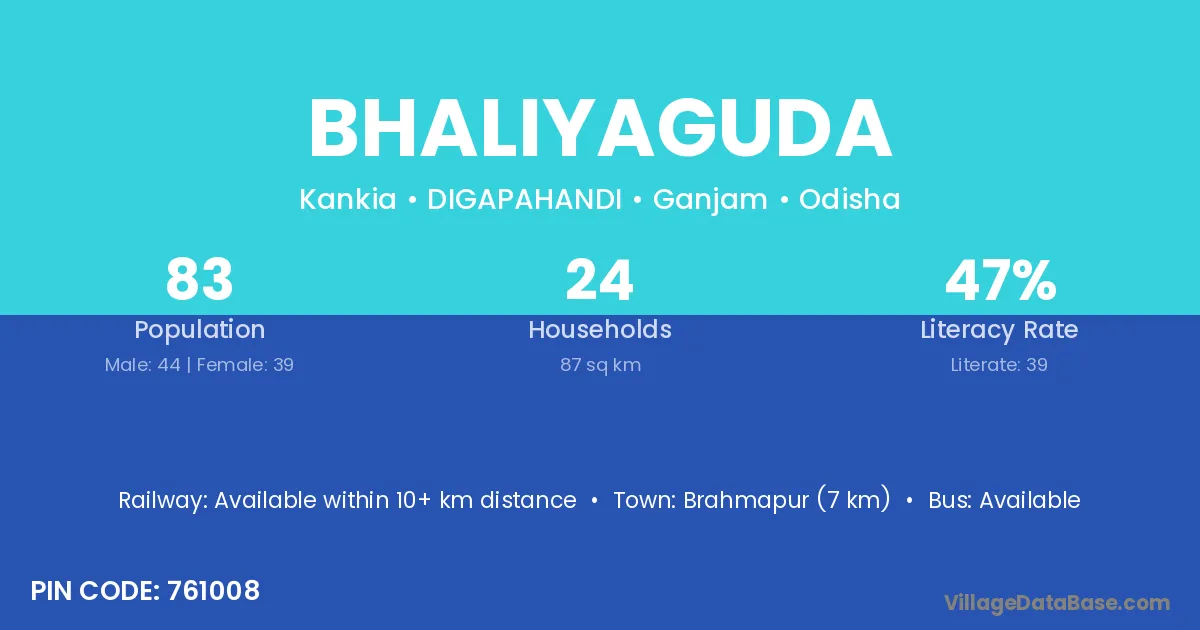 Brahmapur (7 km) is the nearest town to Bhaliyaguda village for major economic activities and is located approximately 7 km away.