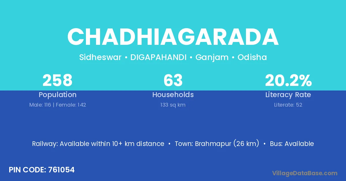 Brahmapur (26 km) is the nearest town to Chadhiagarada village for major economic activities and is located approximately 26 km away.