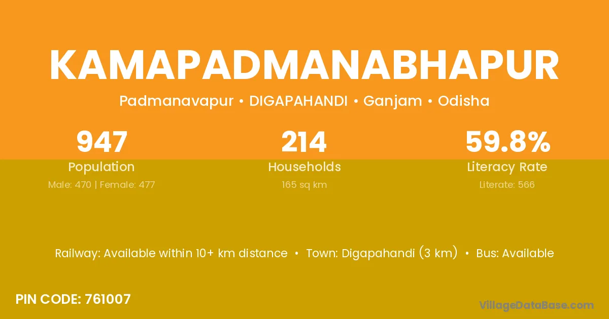 Digapahandi (3 km) is the nearest town to Kamapadmanabhapur village for major economic activities and is located approximately 3 km away.