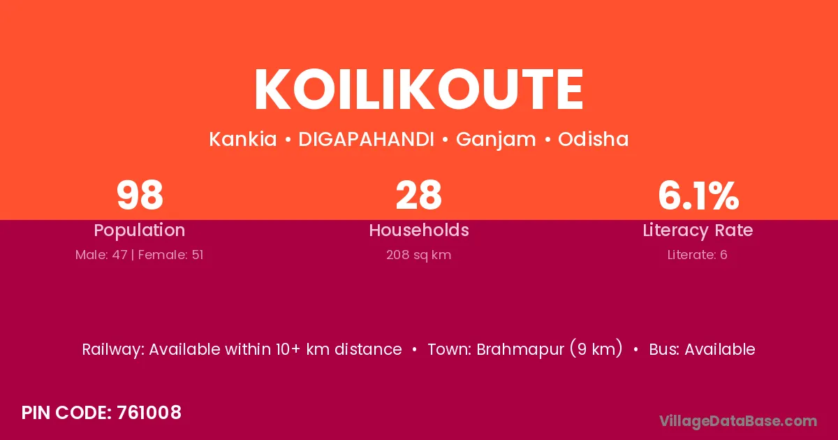 Brahmapur (9 km) is the nearest town to Koilikoute village for major economic activities and is located approximately 9 km away.