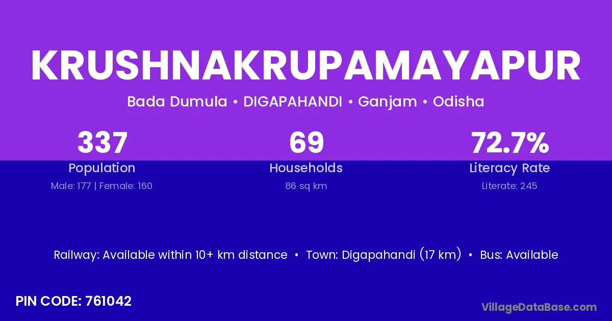 Digapahandi (17 km) is the nearest town to Krushnakrupamayapur village for major economic activities and is located approximately 17 km away.