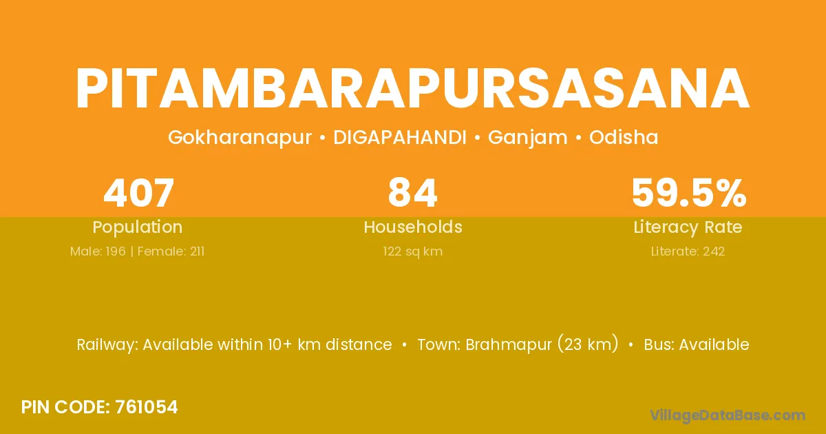 Brahmapur (23 km) is the nearest town to Pitambarapursasana village for major economic activities and is located approximately 23 km away.