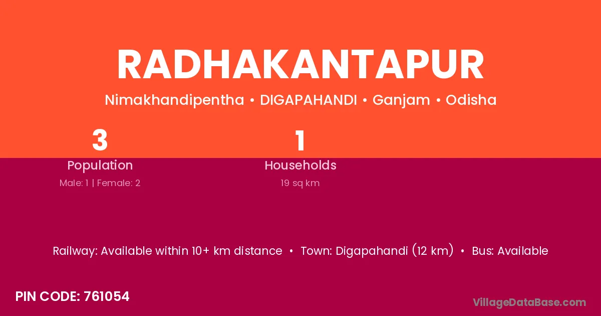 Digapahandi (12 km) is the nearest town to Radhakantapur village for major economic activities and is located approximately 12 km away.