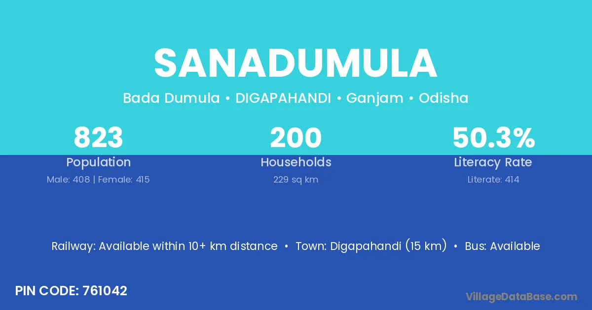 Digapahandi (15 km) is the nearest town to Sanadumula village for major economic activities and is located approximately 15 km away.