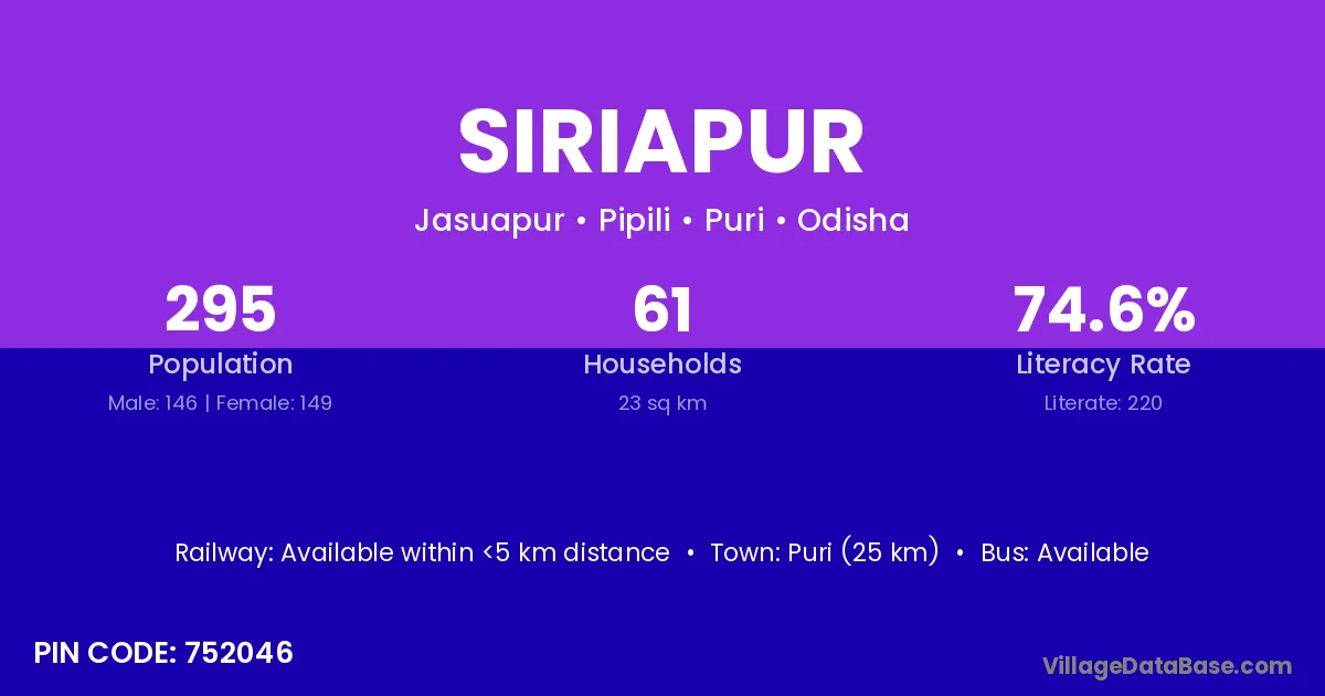 The literacy rate of Siriapur village is 73.19%. Male literacy stands at 85.33% and female literacy at 58.73%.