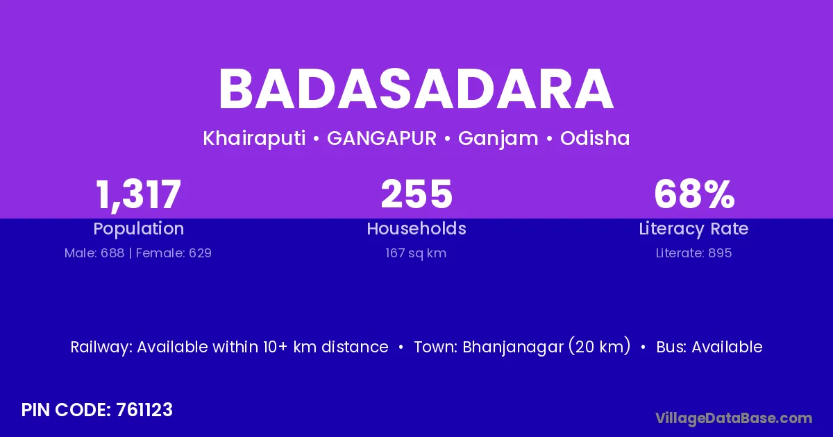Bhanjanagar (20 km) is the nearest town to Badasadara village for major economic activities and is located approximately 20 km away.