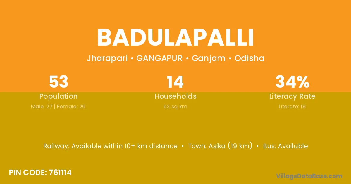 Asika (19 km) is the nearest town to Badulapalli village for major economic activities and is located approximately 19 km away.