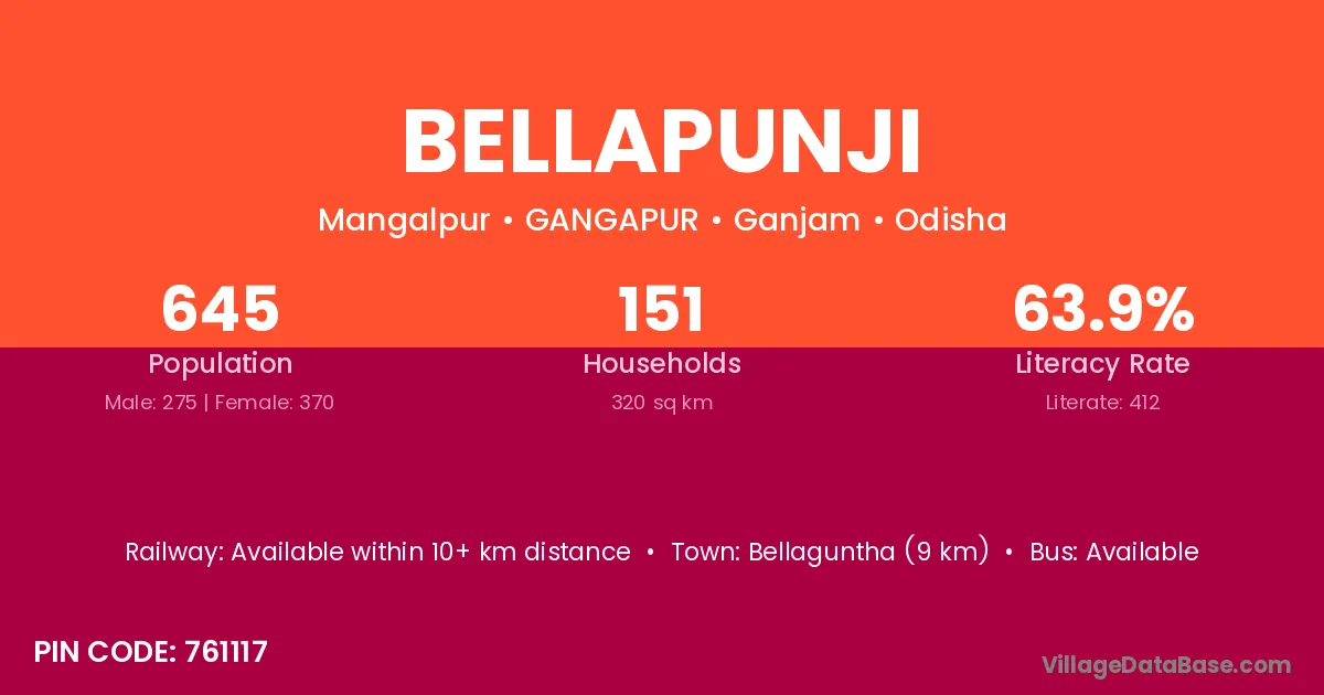 Bellapunji village has a total population of 645 people, of which 275 are males and 370 are females.