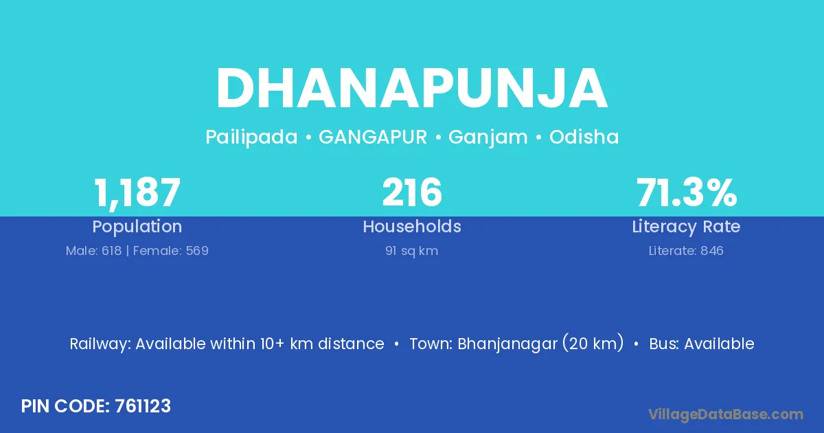 Dhanapunja village has a total population of 1,187 people, of which 618 are males and 569 are females.