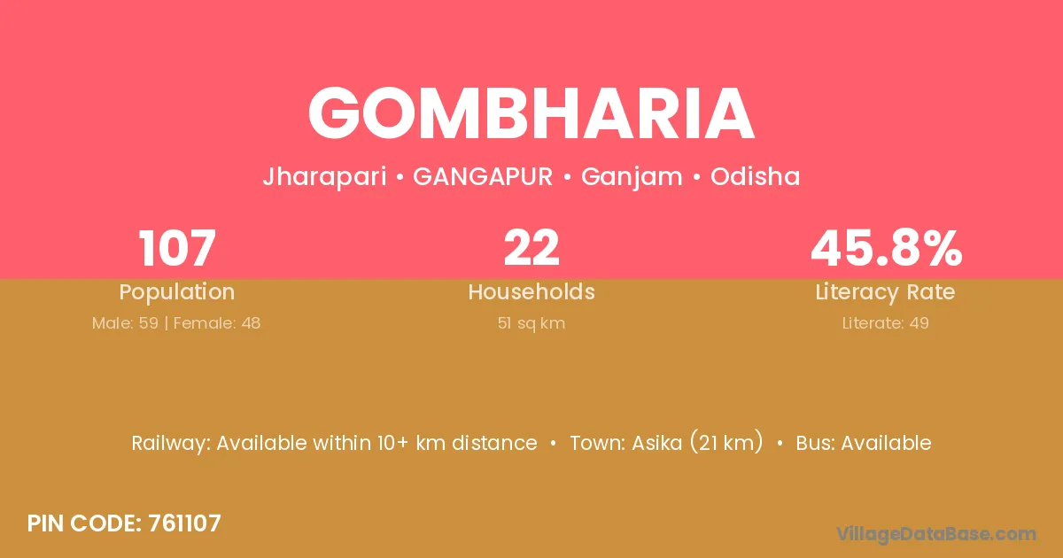 Asika (21 km) is the nearest town to Gombharia village for major economic activities and is located approximately 21 km away.