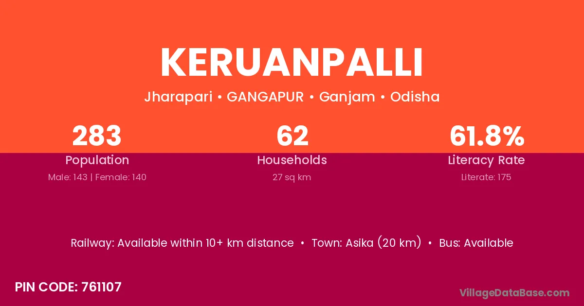 Asika (20 km) is the nearest town to Keruanpalli village for major economic activities and is located approximately 20 km away.