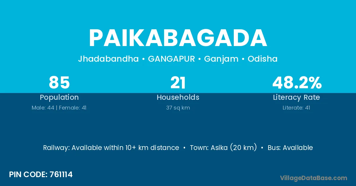Asika (20 km) is the nearest town to Paikabagada village for major economic activities and is located approximately 20 km away.