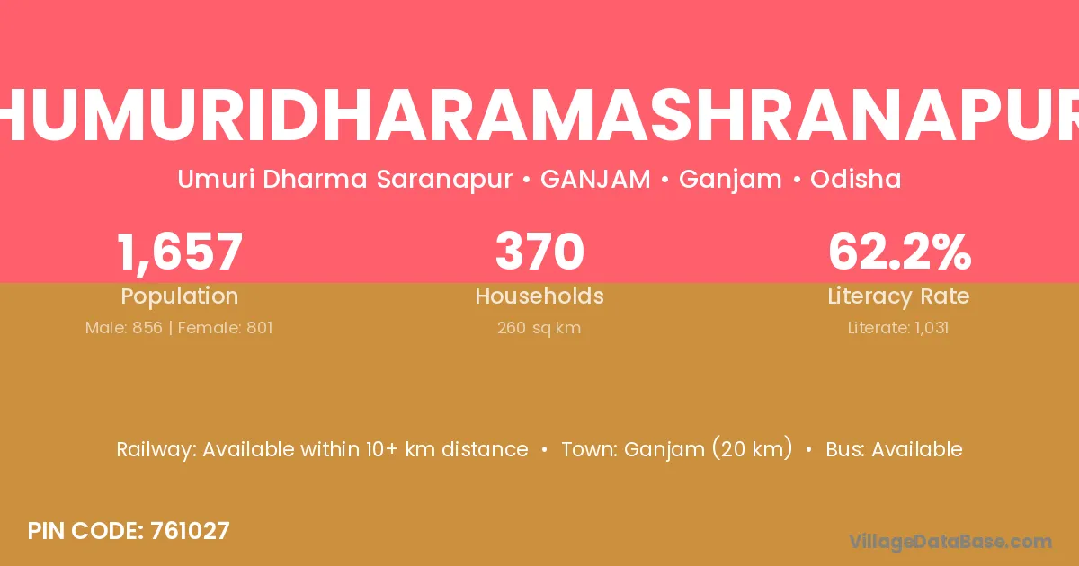 Ganjam (20 km) is the nearest town to Humuridharamashranapur village for major economic activities and is located approximately 20 km away.