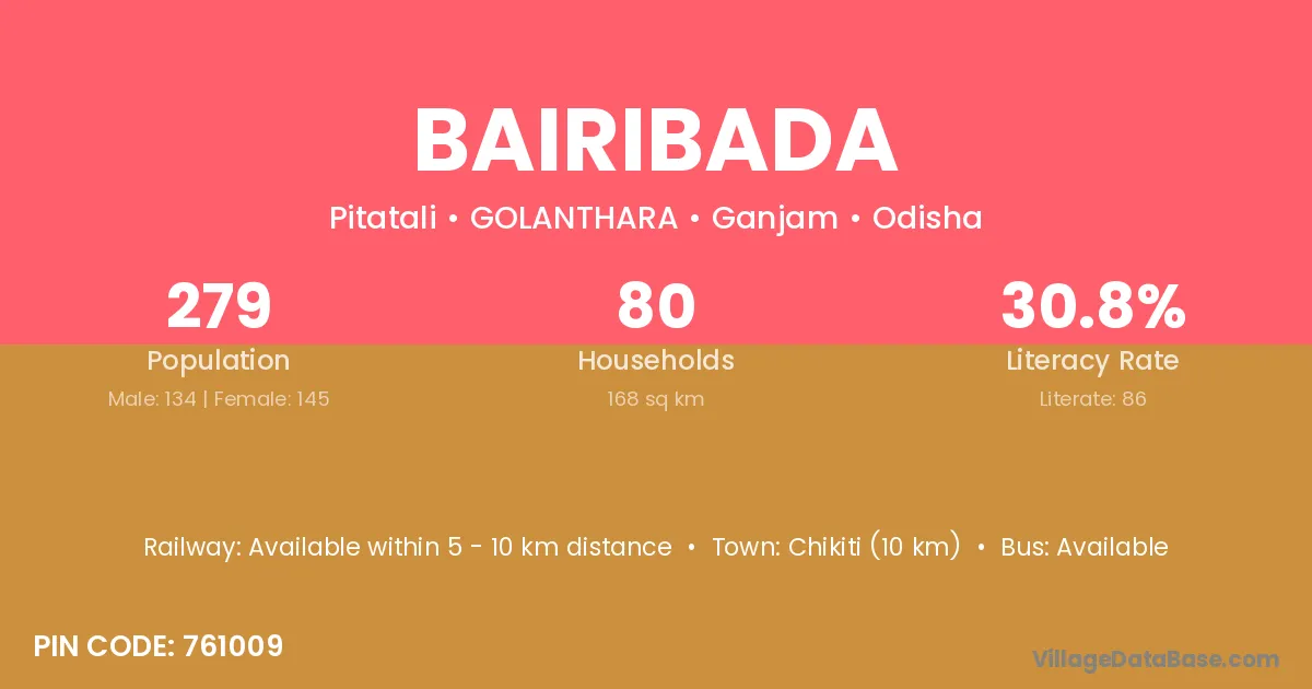 Chikiti (10 km) is the nearest town to Bairibada village for major economic activities and is located approximately 10 km away.