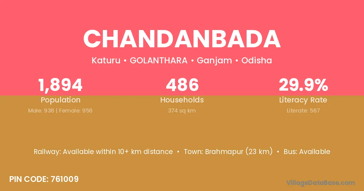 Brahmapur (23 km) is the nearest town to Chandanbada village for major economic activities and is located approximately 23 km away.