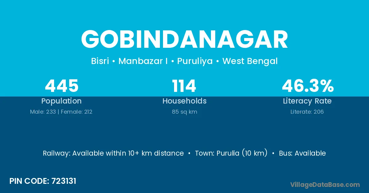 The literacy rate of Gobindanagar village is 65.50%. Male literacy stands at 73.05% and female literacy at 57.86%.