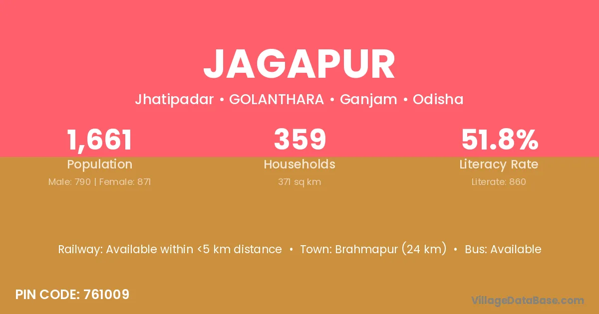 Jagapur village has a total population of 1,661 people, of which 790 are males and 871 are females.