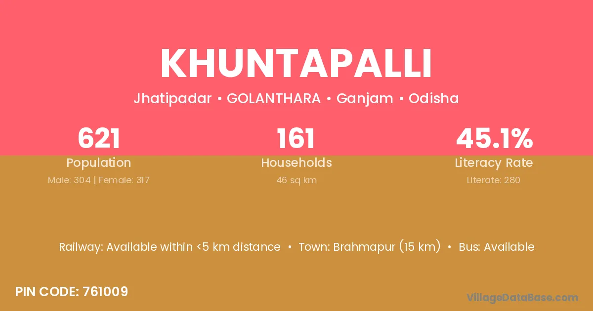 Brahmapur (15 km) is the nearest town to Khuntapalli village for major economic activities and is located approximately 15 km away.