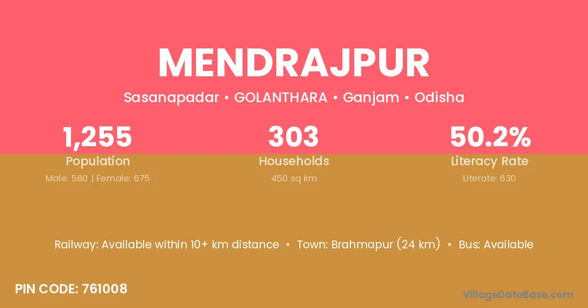 Brahmapur (24 km) is the nearest town to Mendrajpur village for major economic activities and is located approximately 24 km away.
