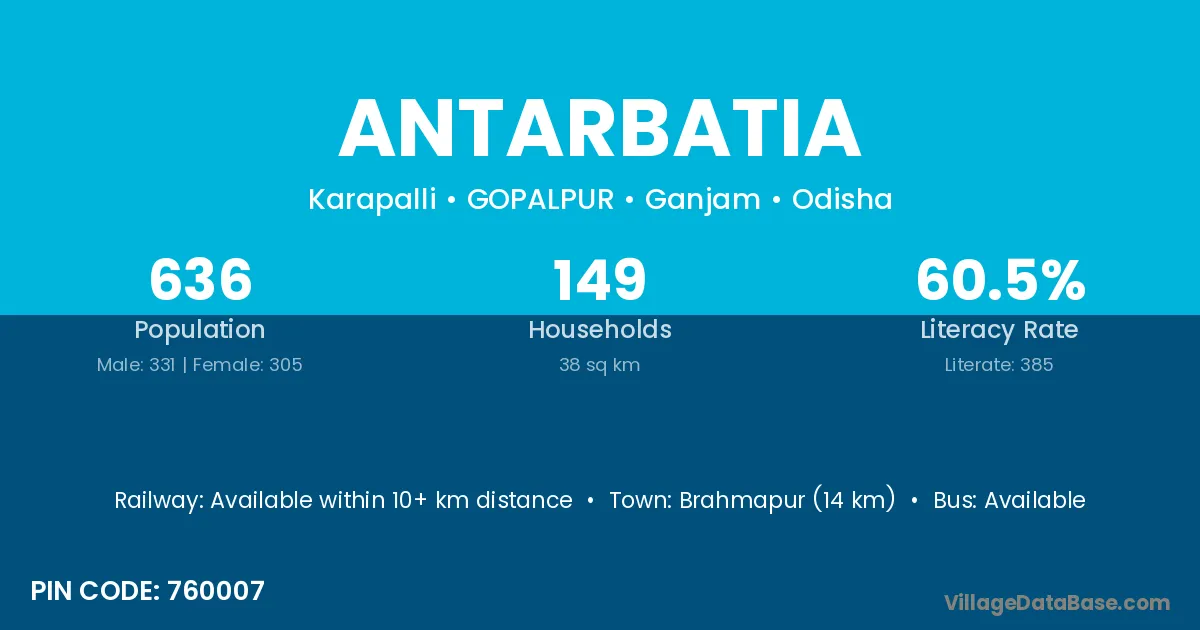 Brahmapur (14 km) is the nearest town to Antarbatia village for major economic activities and is located approximately 14 km away.