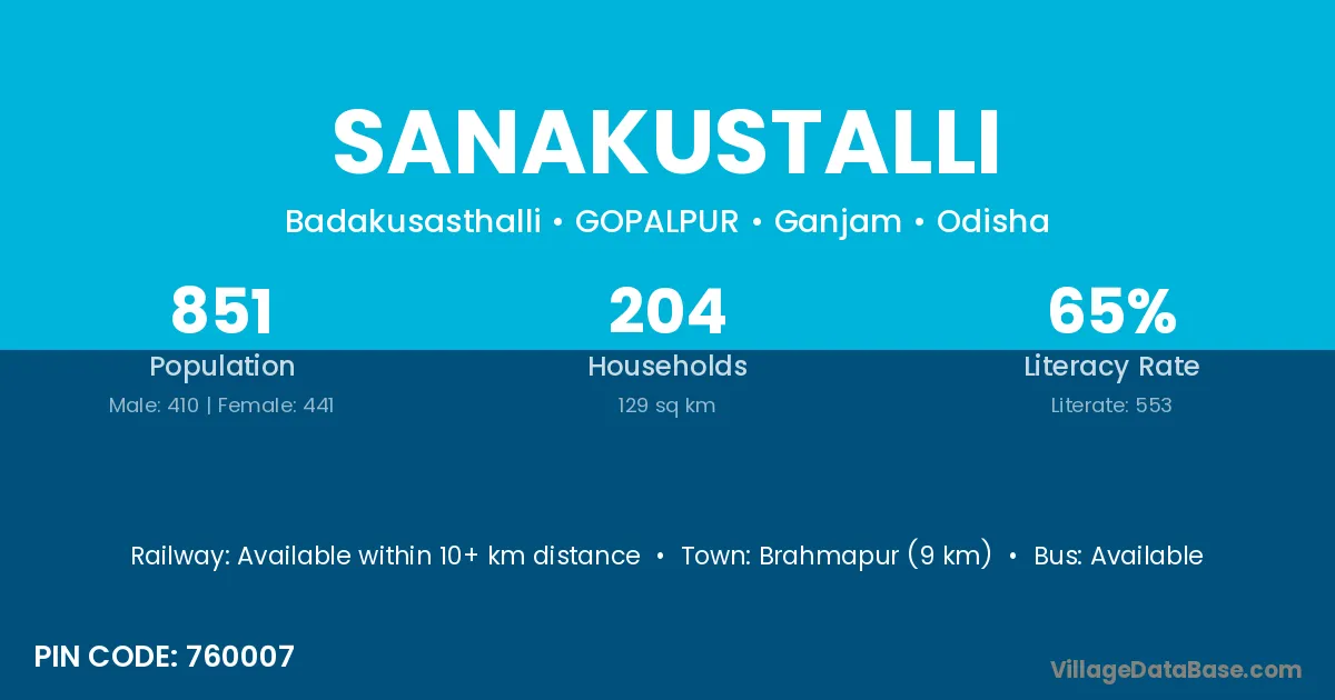 Brahmapur (9 km) is the nearest town to Sanakustalli village for major economic activities and is located approximately 9 km away.