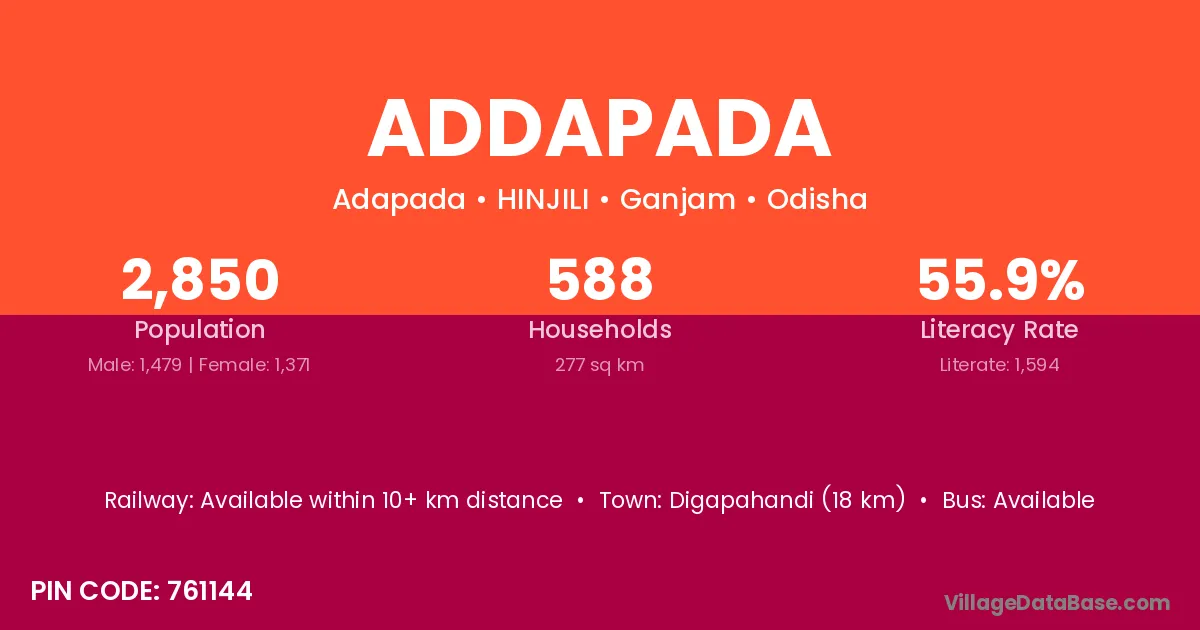 Digapahandi (18 km) is the nearest town to Addapada village for major economic activities and is located approximately 18 km away.
