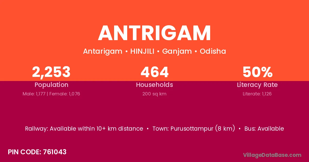 Purusottampur (8 km) is the nearest town to Antrigam village for major economic activities and is located approximately 8 km away.