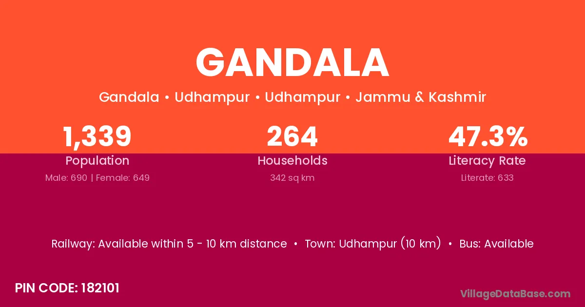 The literacy rate of Gandala village is 61.92%. Male literacy stands at 70.53% and female literacy at 53.87%.